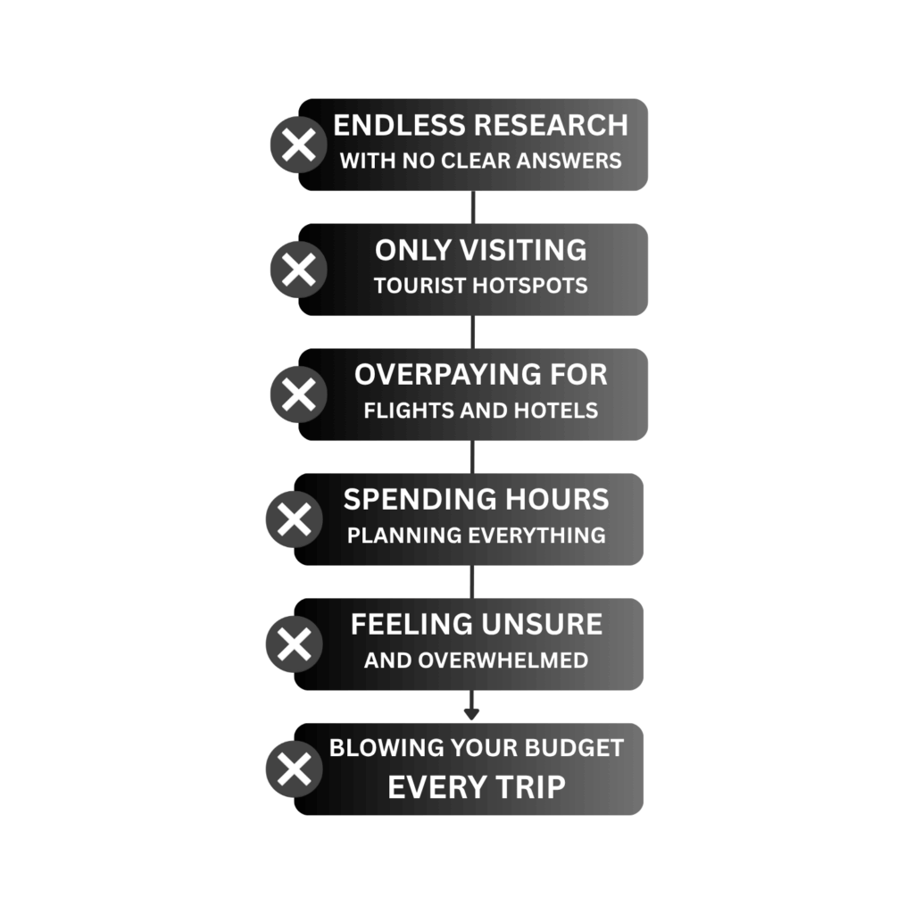 Finally, you unlock itineraries, tools, and booking hacks that let you travel smoother, longer, and with more freedom — no travel agent, no stress.